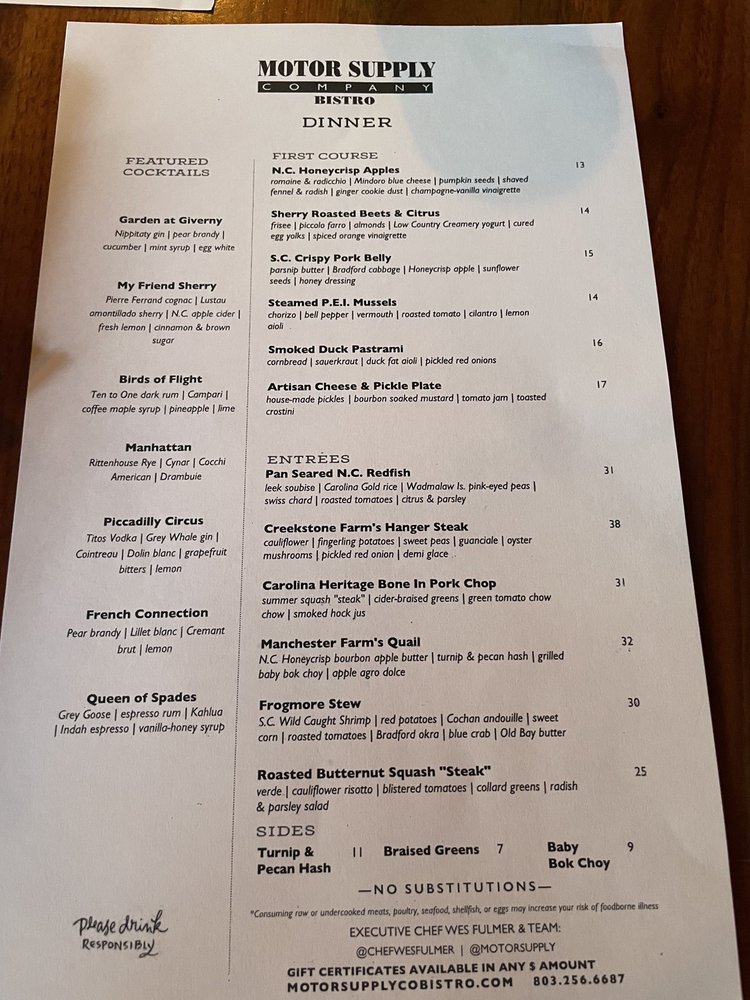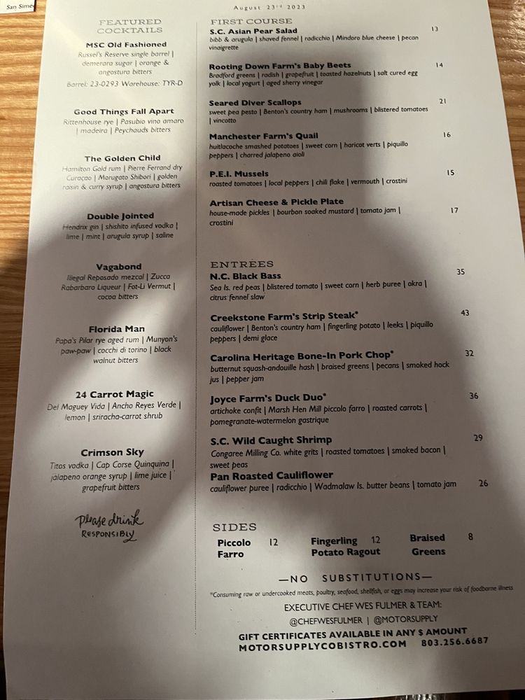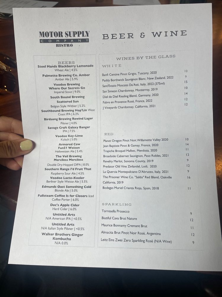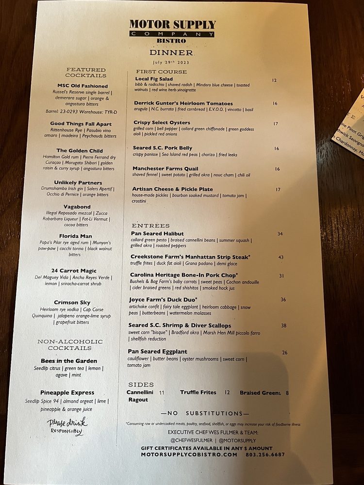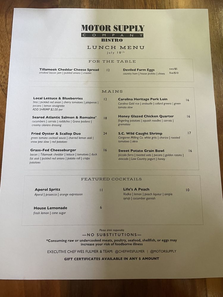 **Motor Supply Co Bistro** is a New American restaurant located in Columbia, SC that offers a range of unique dishes. With a variety of options from soups and salads to distinctive entrees, this restaurant caters to a diverse set of tastes. Customers praise the ambiance and service, with many highlighting their favorite dishes such as the shrimp and grits, Seared S. C. Wahoo, and Sweet Potato Gnocchi. The attention to detail in the presentation and flavors of each dish shows the commitment to quality that Motor Supply Co Bistro strives for. With options for vegan and vegetarian diets, as well as various amenities like outdoor seating and a full bar, this restaurant caters to a wide range of preferences. Overall, Motor Supply Co Bistro provides a memorable dining experience that keeps customers coming back for more.