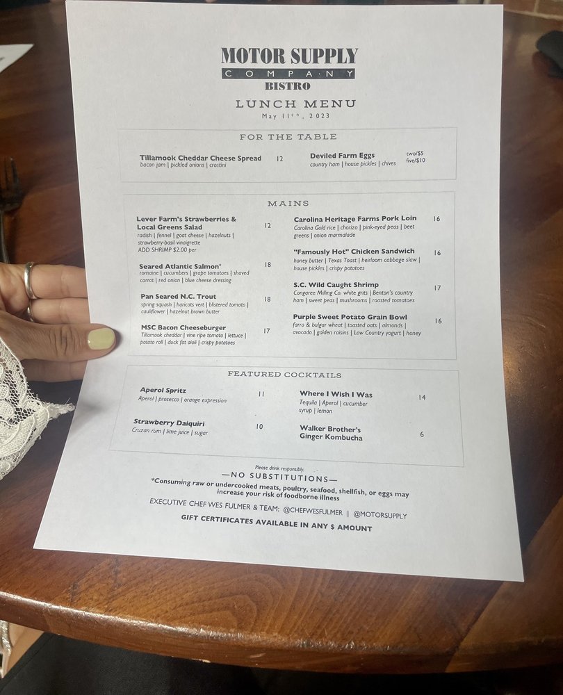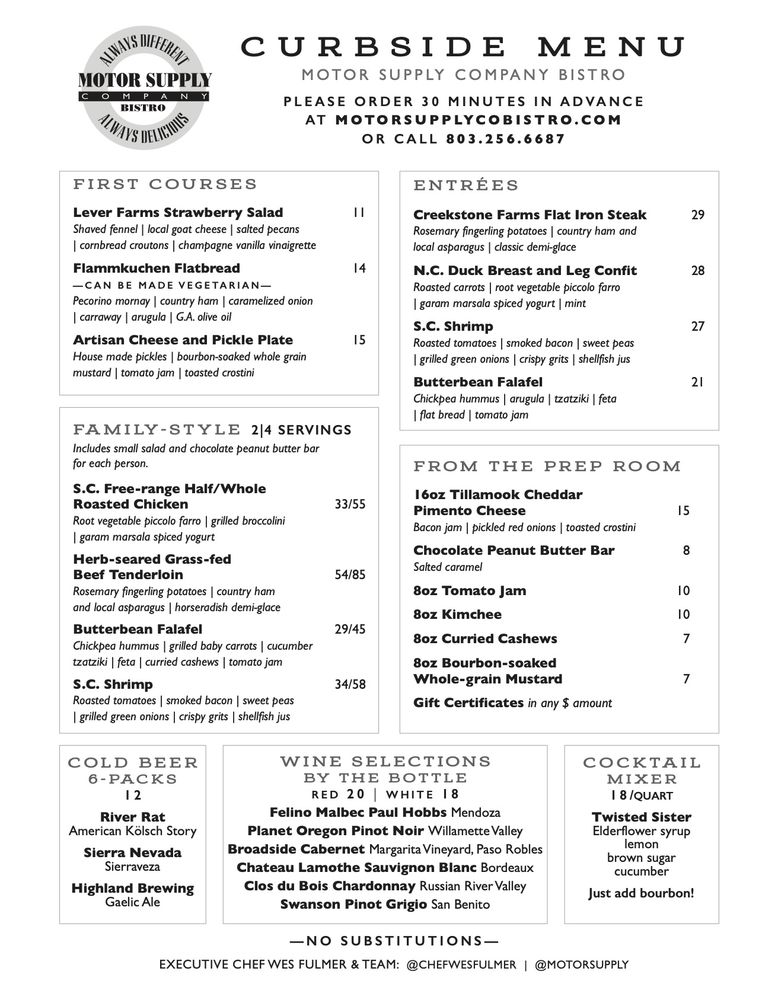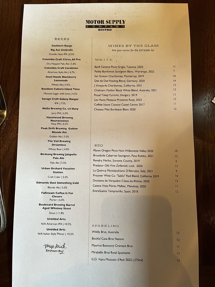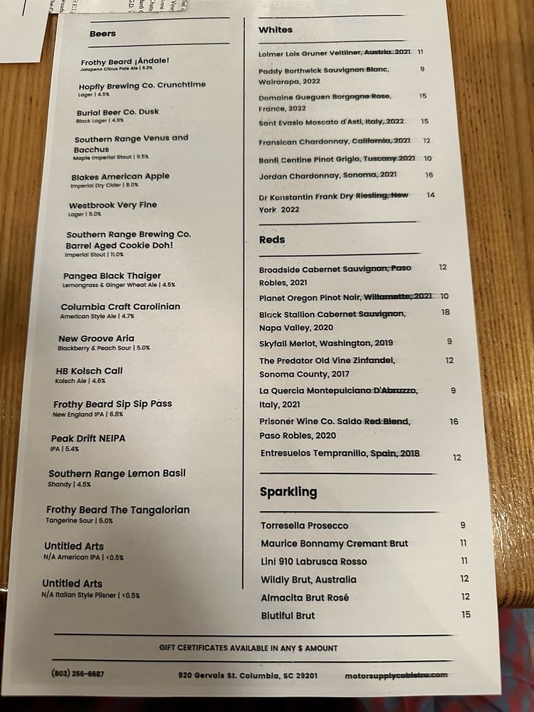 **Motor Supply Co Bistro** is a New American restaurant located in Columbia, SC that offers a range of unique dishes. With a variety of options from soups and salads to distinctive entrees, this restaurant caters to a diverse set of tastes. Customers praise the ambiance and service, with many highlighting their favorite dishes such as the shrimp and grits, Seared S. C. Wahoo, and Sweet Potato Gnocchi. The attention to detail in the presentation and flavors of each dish shows the commitment to quality that Motor Supply Co Bistro strives for. With options for vegan and vegetarian diets, as well as various amenities like outdoor seating and a full bar, this restaurant caters to a wide range of preferences. Overall, Motor Supply Co Bistro provides a memorable dining experience that keeps customers coming back for more.